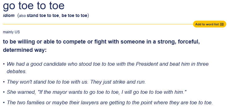 Go toe to toe 언제 사용하는지 예문과 함께 알아보죠.