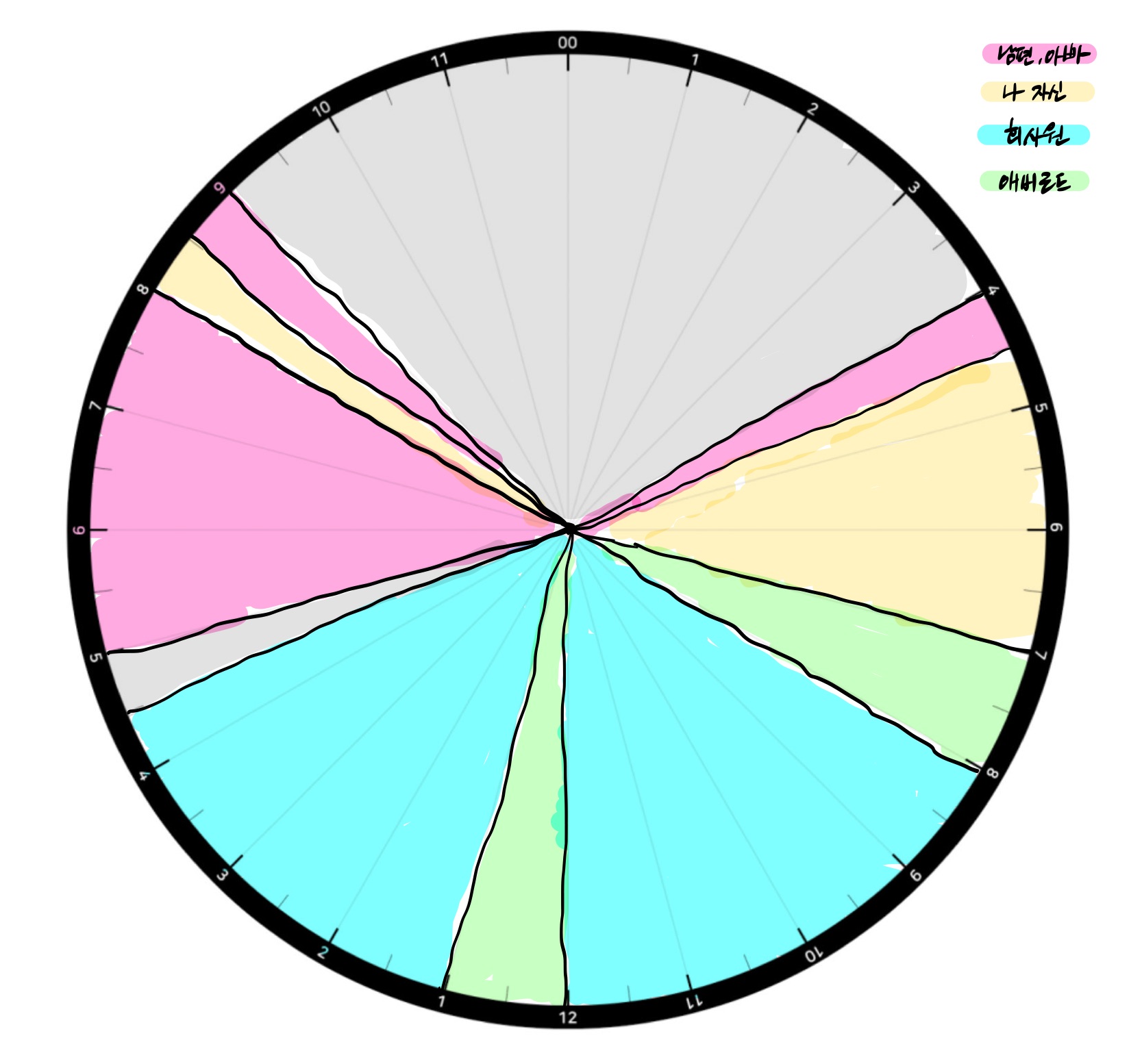 각 공간마다 나의 페르소나가 달라집니다. 이 때 부터는 각 방을 용도에 맞게 채워나가보는 과정입니다. 저의 복직 후 하루 일과를 예시로 가져와 봤어요. 저는 총 4개의 역할(가족,나,회사원,애비로드)로 구분해서 하루를 살아갑니다.
