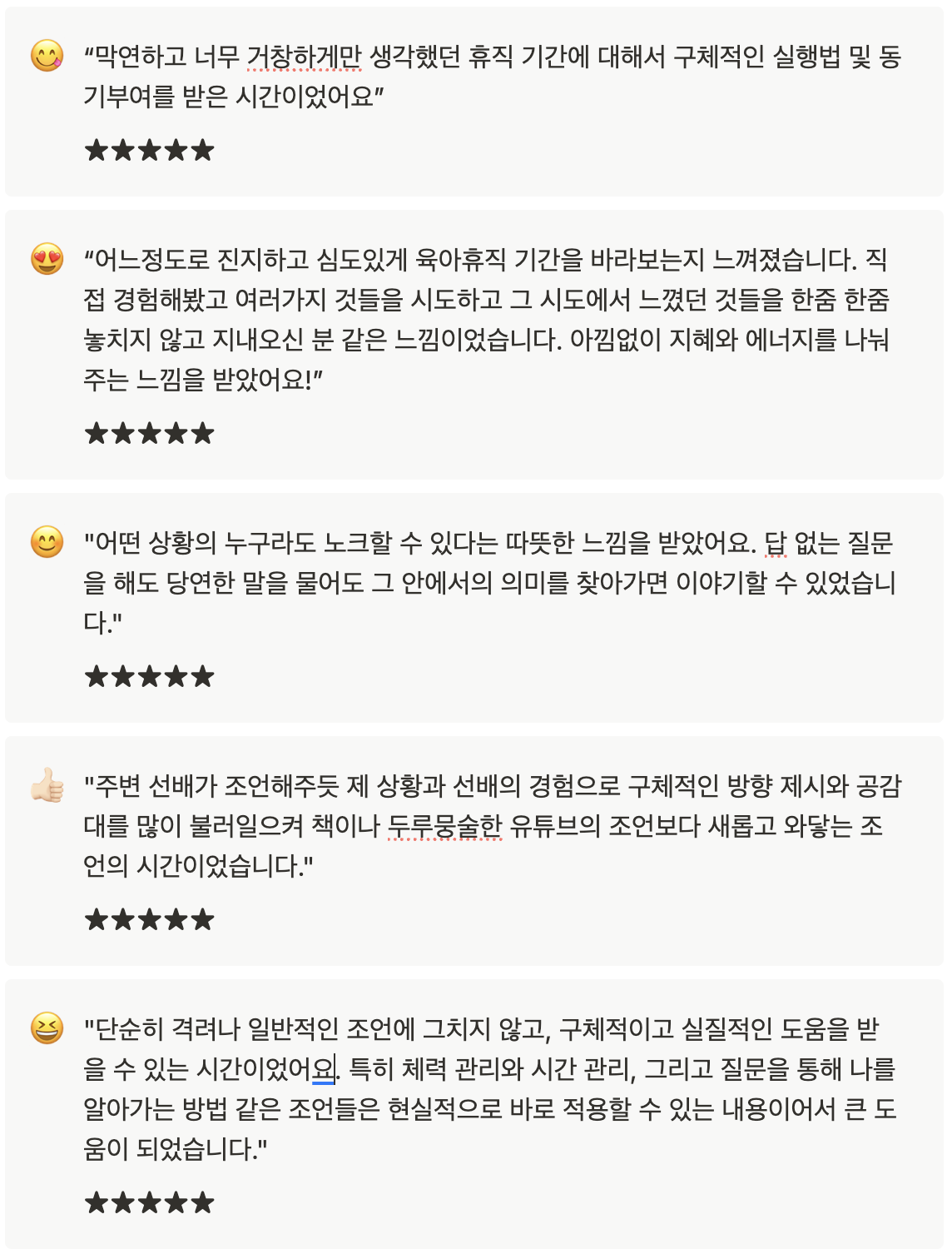갓생 정신으로 치열하게 보내온 육아휴직+복직의 시간인 4년간의 많은 노력과 도전과 시행착오를 기반으로 수십명 육아휴직자들과 이야기 나누었고, 아무런 플래닝 과정 없이 1시간만의 유선상담 기준으로도 종합 평점 4.7점, 5만원 이상의 가치를 인정받았습니다.