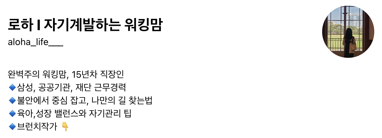 제 현재 상황이 들어가 있는 테마들, 저와 현재 상황이 비슷한 워킹맘들을 타깃으로 하는 게 맞는 것 같아요. 예전 것에 갇혀 있을 필요는 없다고 생각해요. 워킹맘에게 도움을 줄 수 있는 사람의 프레임으로 지금 스레드에서 이것저것 얘기해보고 있어요.