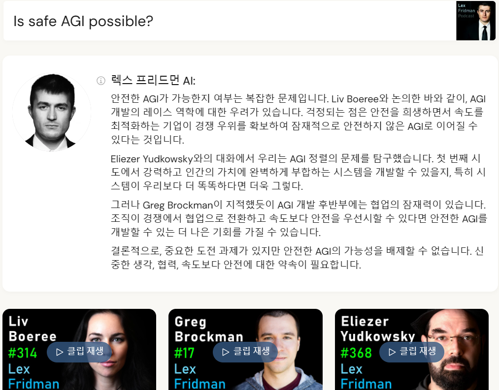 특히 2~3시간 짜리 팟캐스트를 그냥 틀어주는 것이 아니라, 정확히 답변에 참조되었던 부분에서 영상이 시작하는 것이 매우매우 좋았습니다.