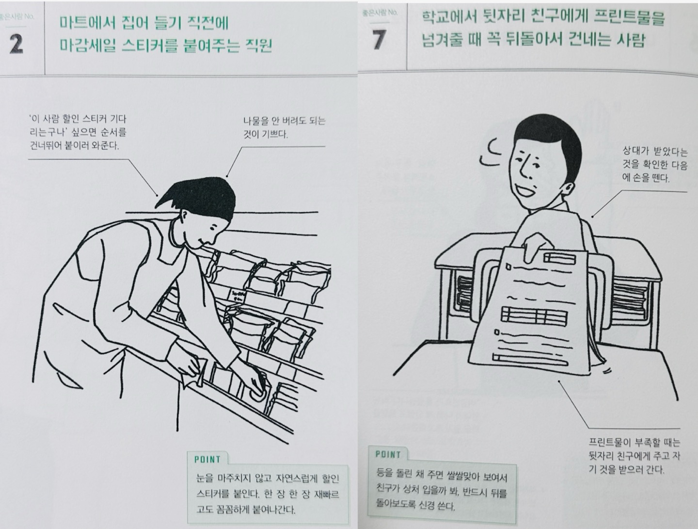 그럼 이들의 시선에 든 '착한 사람'은 어떤 이들일까요. 마트에서 집어 들기 직전에 마감세일 스티커를 붙여주는 직원, 뒷자리 친구에게 프린트물을 넘겨줄 때 꼭 뒤돌아서 건네는 사람, 바쁠 때도 말을 걸면 일단 키보드 치는 손을 멈춰주는 선배, 노래방에서 다른 사람이 노래하고 있을 때 핸드폰을 보지 않는 사람, 영화의 엔딩 크레디트까지 보는 사람, 아이가 이야기할 때 시선을 맞춰 쪼그려 앉는 사람, 양쪽 부모가 모두 계시다는 전제로 질문을 안 하는 사람, 어디서 샀는지 물어봤을 때 제품 링크까지 보내주는 사람, 오래 함께 한 봉제인형을 버릴 때 가슴이 욱신거리는 사람... 아, 그리고 목적지에 도착하면 몸이 욱신거릴 걸 알면서도 "의자를 뒤로 젖혀도 될까요?"라고 묻지 못하는 사람도 있네요. 제가 고른 '착한 사람'들입니다. 이밖에도 제 기준과 크게 다르지 않은 '착한 사람'이 많은데, 역시 나라와 사회, 문화의 경계를 넘어 '좋은 사람'에 대한 정서에는 공통점이 있는 모양입니다.