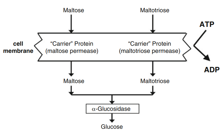 효모가 말토오스와 말토트리오스를 활용하기 위해서는 먼저 이 당들을 세포 내부로 운반해야 합니다. 이때, 투과효소(permease)가 말토오스와 말토트리오스를 세포막을 통해 내부로 이동시키죠. 세포 안으로 들어온 당은 α-글루코시다아제(α-glucosidase)라는 효소에 의해 포도당으로 분해됩니다.