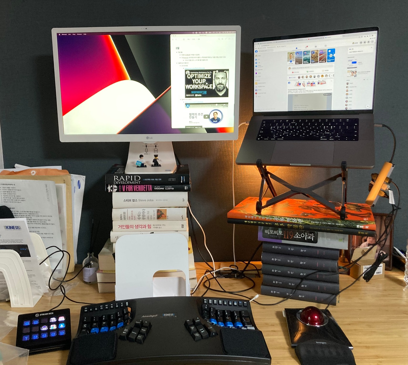또한 우리의 눈이 어디를 보고 있는가도 깨어있는 것과 큰 연관이 있습니다. 기본적으로 코의 위치보다 조금 위쪽을 바라보면 더 깨어있게 되고, 아래를 보면 더 차분해지고 졸리다고 합니다. 저는 원래도 목 건강을 위해 책을 쌓아서 모니터를 높였었지만 이 얘기를 듣고 책을 훨씬 더 쌓았습니다. 세팅 직후에는 아래 사진만큼 높았는데, 너무 높였는지 목이 뻐근하길래 지금은 두꺼운 책을 한 권씩은 빼둔 상태입니다.