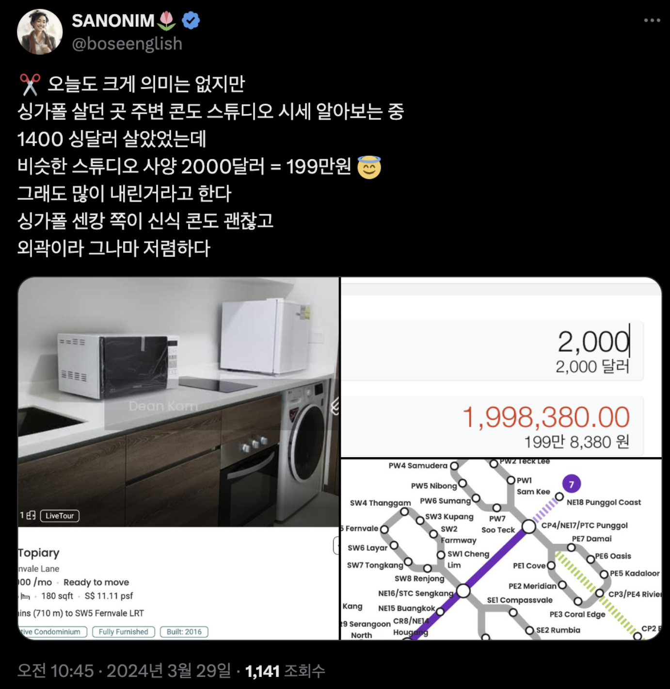 ์ ๋ ํ์ข ํ๊ฐ๋ผ๋ ์ฝ๋ฆฌ์ ํ์ด ์ผํธ๋ด ์ง์ญ์์ ํ์ ํ ์ ์ด ์์์ต๋๋ค. ๊ฐ์ธ์ฃผ์๊ฐ ๊ฐํด์ ๊ทธ๋ฐ์ง ์์งํ ํ๋ค์์ด์ ๐ฅฒ 1,000๋ถ ๋๋๋ฐ, ์ง๊ธ์ HDB๋ผ ํ ์ง๋ผ๋ ์ผํธ๋ด ์ง์ญ์์ ์ปค๋จผ๋ฃธ, 1,000๋ถ์ ์กฐ๊ธ ํ๋ค์ง ์์๊น ์ถ์ด์ ๐