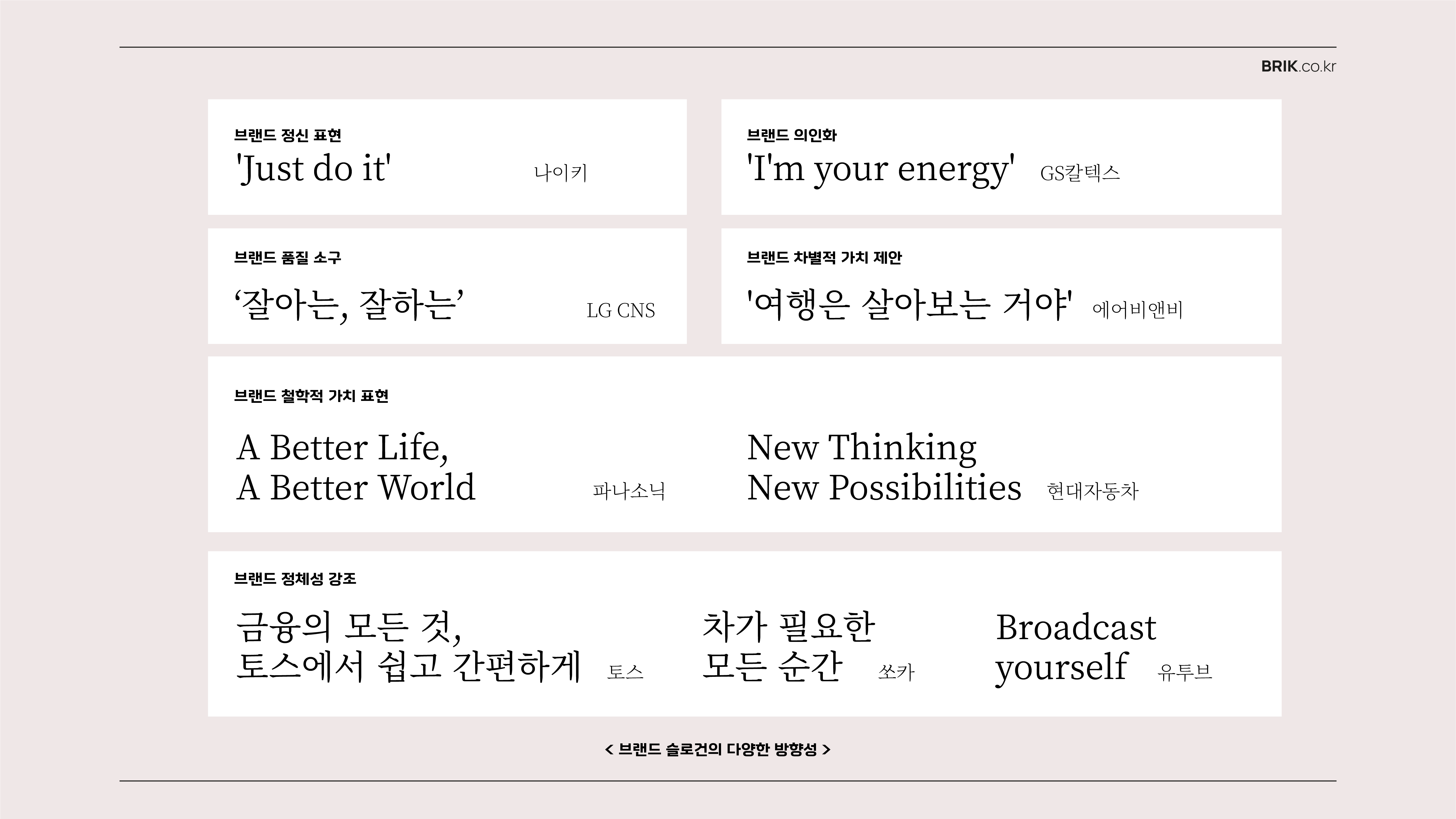 이 외에도 브랜드가 슬로건에 담고자 하는 강조점에 따라 슬로건의 방향성을 여러 가지로 분류할 수 있습니다. 어떤 게 정답이라기보다는 브랜드의 경영 환경에 따라, 추구하는 가치에 따라 다 달라집니다.