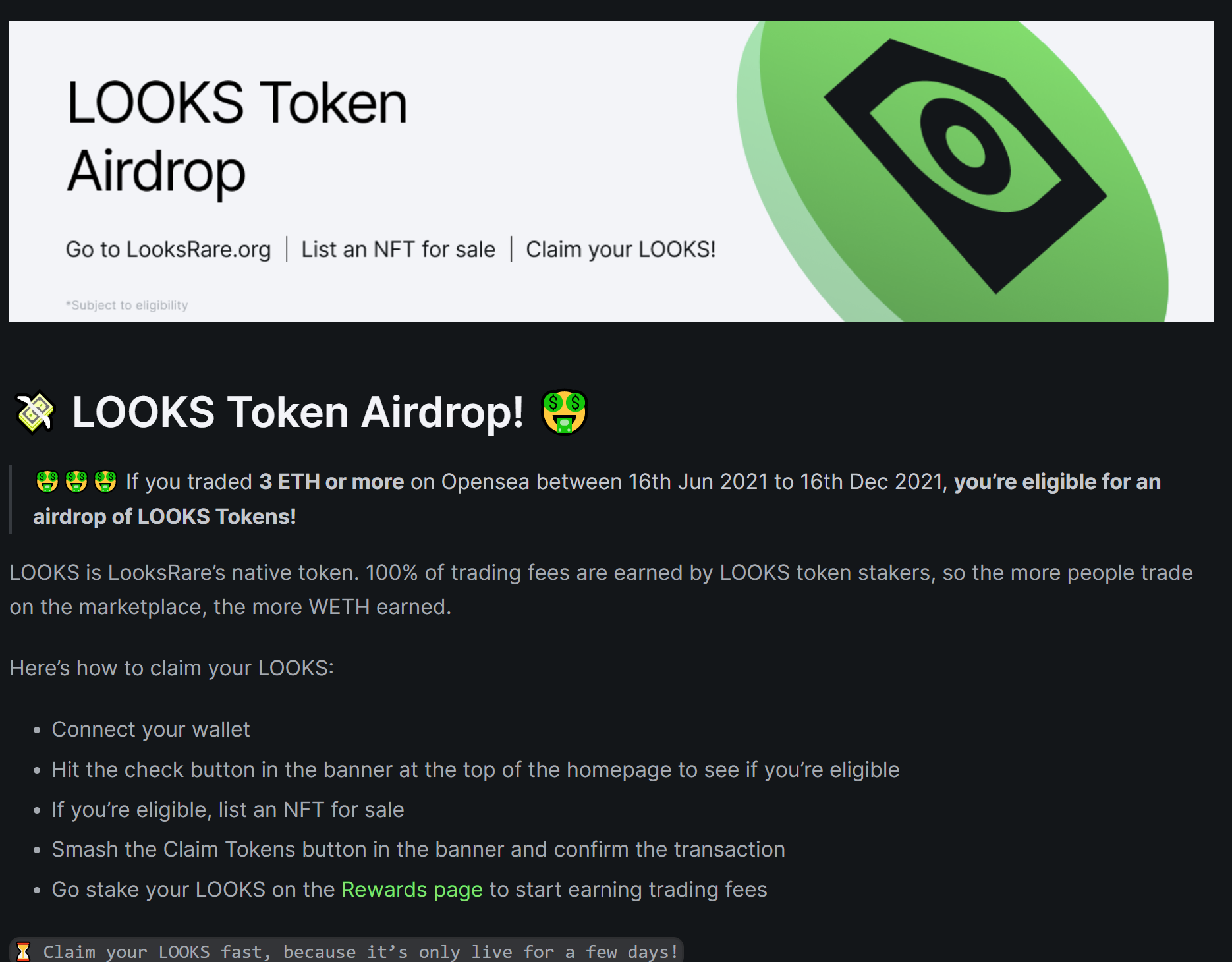 룩스레어에서는 오픈씨에서 2021/06/16 ~ 2021/12/16 기간 동안 3 ETH 거래한 블록체인 유저들에게 자체 플랫폼 토큰인 $LOOKS 토큰을 에어드랍 해주고 있어요!