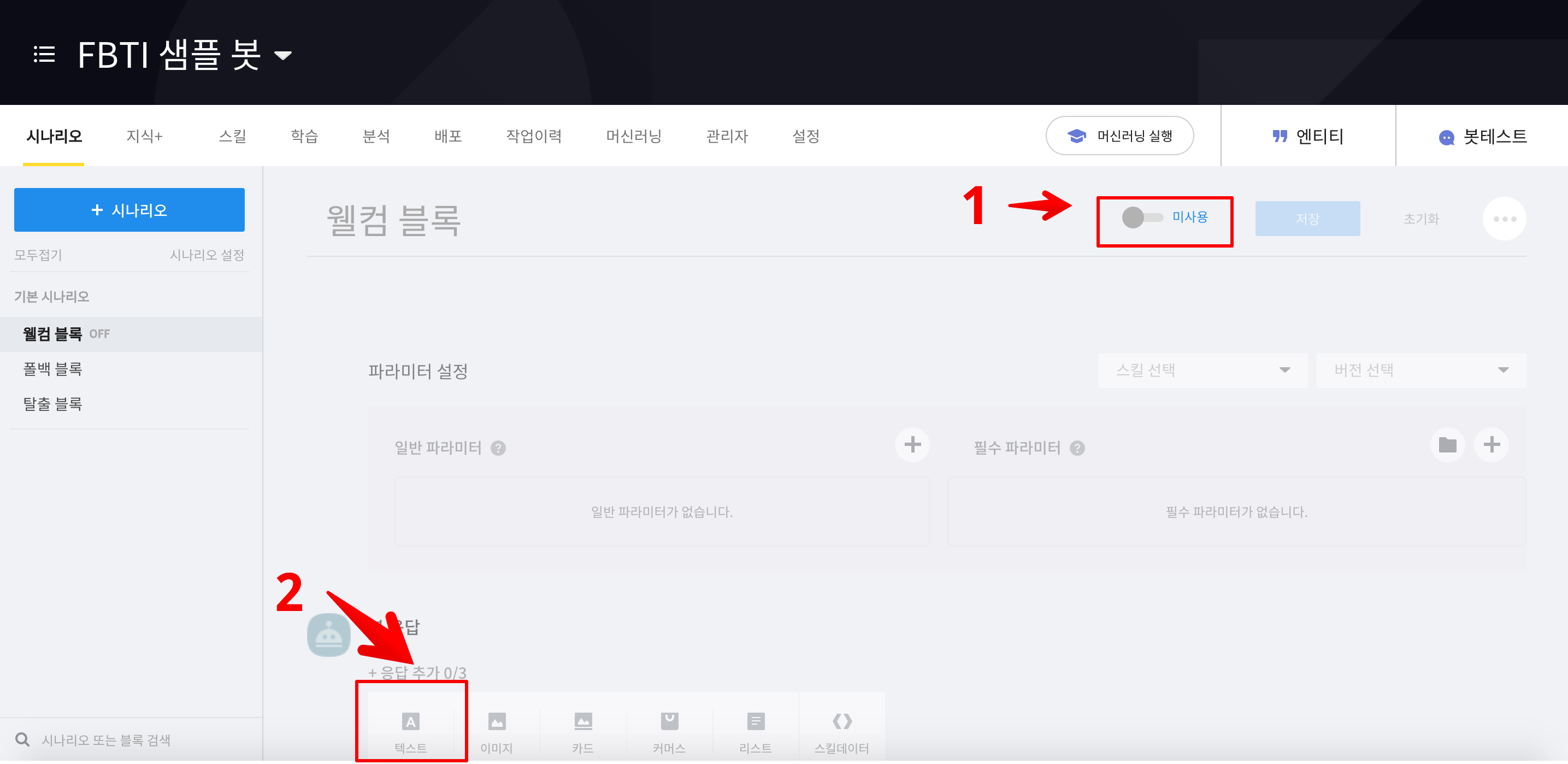 그리고 "블록" 안에서 챗봇의 답변과 그 답변을 유도할 질문을 설정할 수 있습니다.