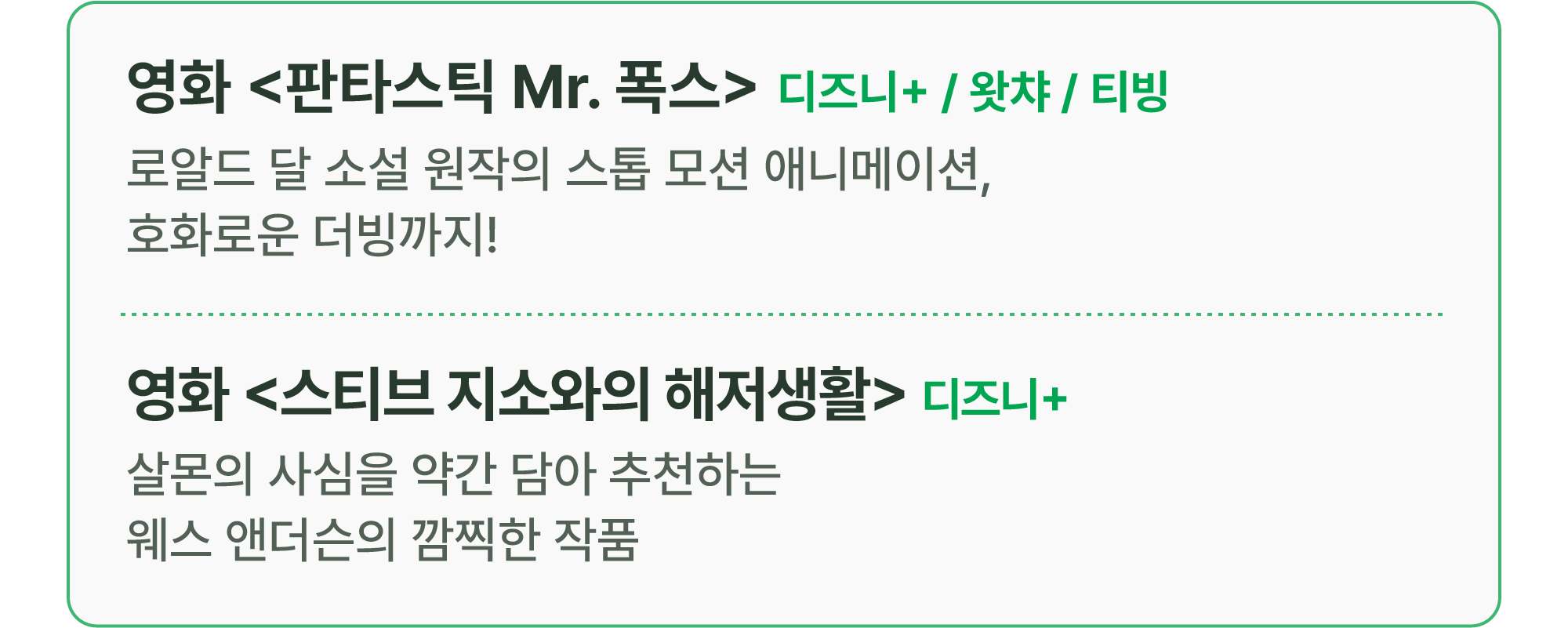2021년 넷플릭스가 로알드 달 스토리 컴퍼니를 인수한 이후, 넷플릭스의 지원을 받아 소설의 각색이 이루졌습니다. 연휴가 끝나고 구독자님의 소중한 시간을 채우기에 이 네 편의 단편 영화들은 부족함이 없을거예요!