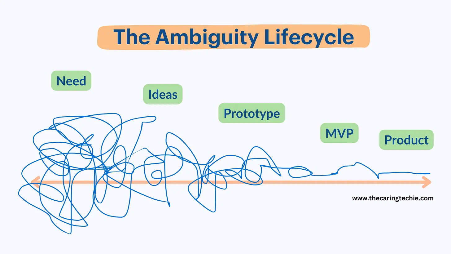 이때 여러분이 가져야 할 목표는 아래 "모호함 생애주기 다이어그램(The Ambiguity Lifecycle)"에 설명된 대로 문제를 막연한 요구사항에서 유효한 제품으로 전환하는 것입니다.