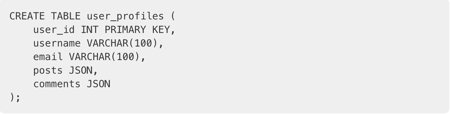 이 플랫폼은 사용자 프로필과 관련 게시물 및 댓글에 대해 높은 읽기 트래픽을 경험하므로 게시물과 댓글을 user_profiles 테이블 내에 JSON 배열로 저장합니다.