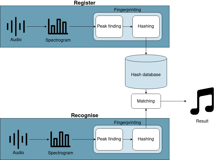 가장 먼저 눈에 띄는 점은 다이어그램이 등록(register)과 인식(recognise) 흐름으로 나뉜다는 것입니다. 등록 흐름은 노래를 기억하여 나중에 인식할 수 있게 합니다. 인식 흐름은 짧은 오디오 섹션을 식별합니다.