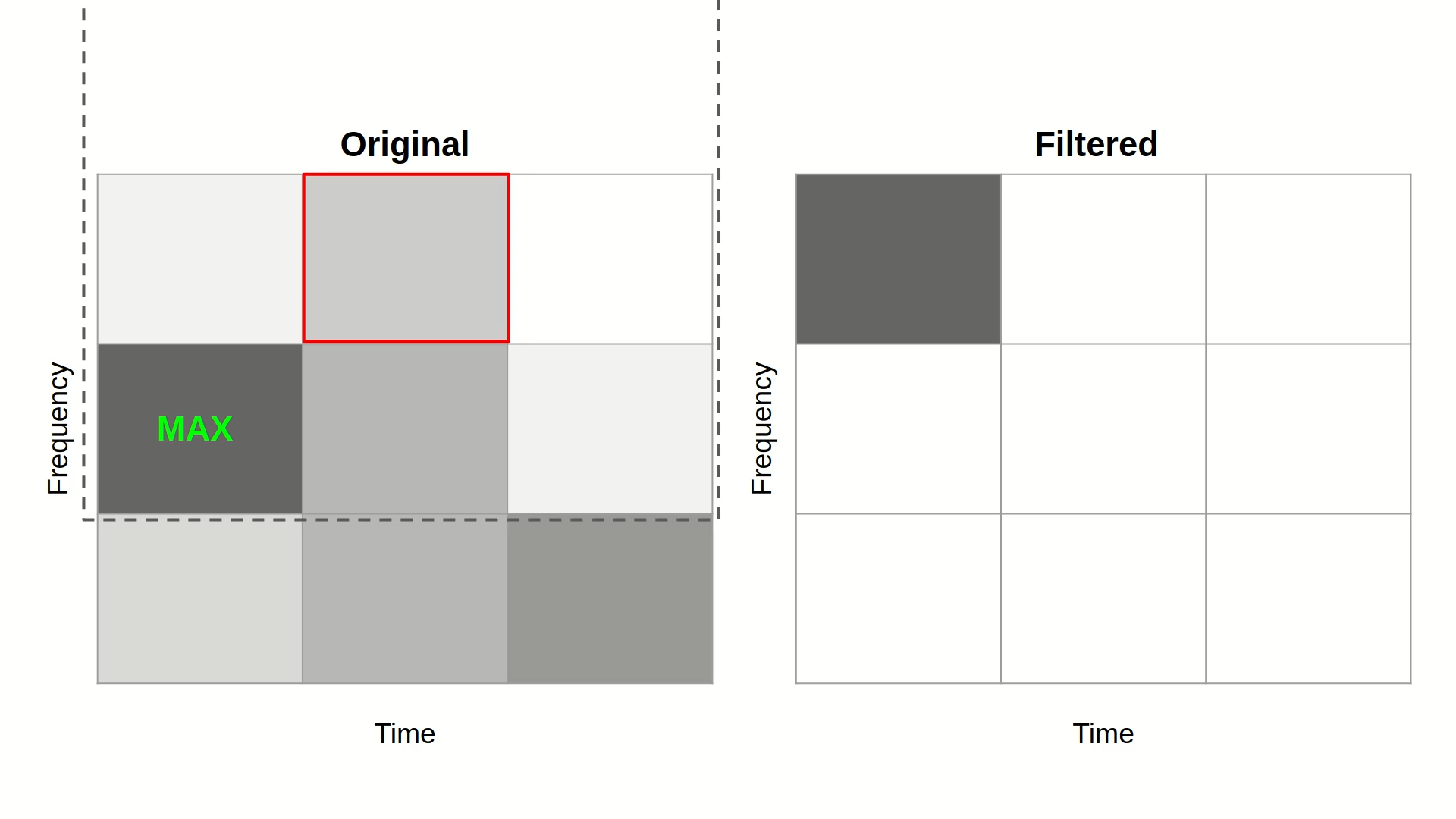 최대 필터가 모든 작업을 하지는 않습니다. 필터는 지역 피크를 강조했지만 위치를 찾지 않았습니다. 피크 위치를 찾기 위해서는 원래 스펙트로그램과 필터링된 스펙트로그램에서 값이 같은 지점을 찾아야 합니다.