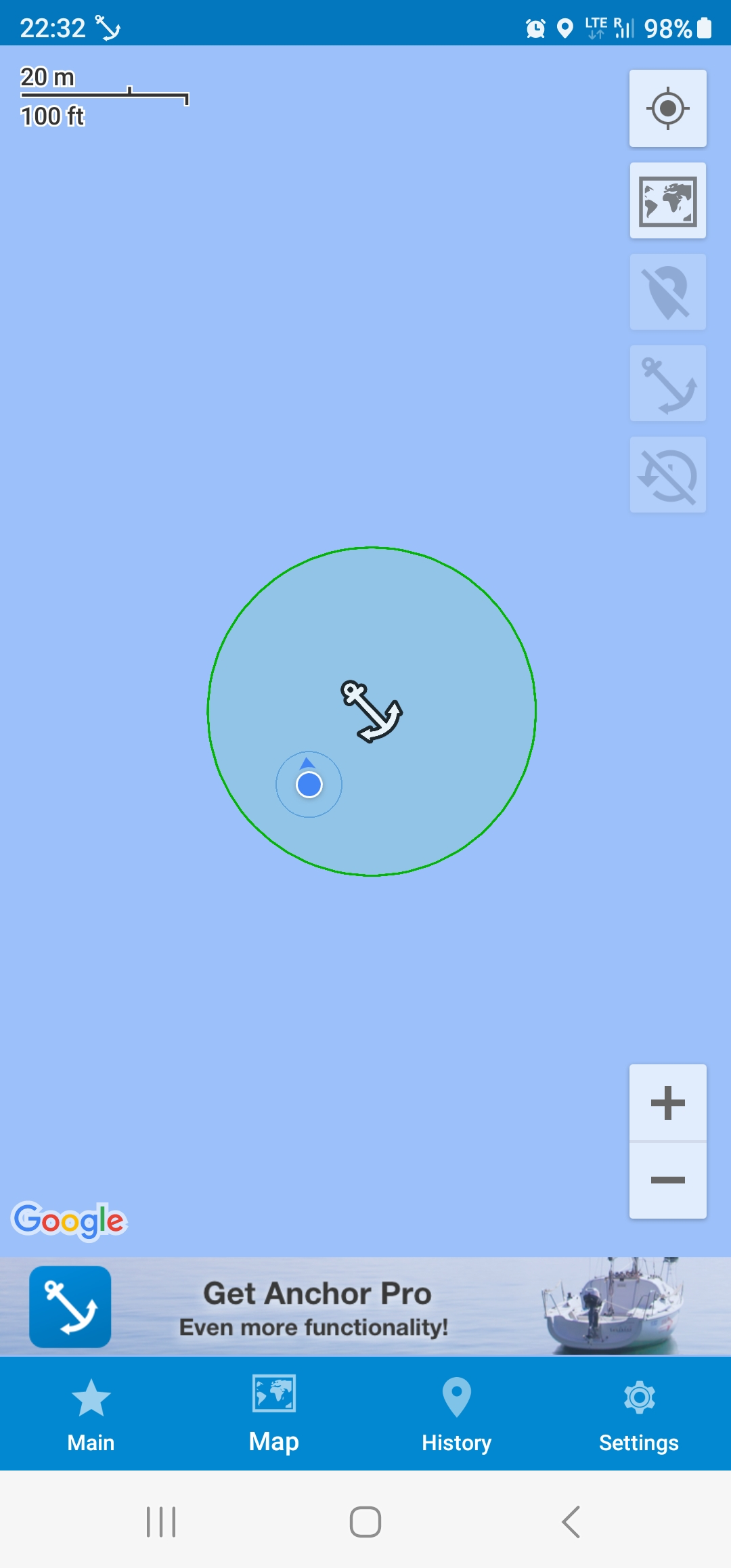닻 내리고 보내는 밤, 혹시라도 닻이 밀릴까 걱정되는 마음을 달래고 잠을 청해야 합니다. 이런 걱정을 덜어줄 수 있는 두 가지 앱이 있는데 첫번째는 앵커라이트Anchor Lite라는 앱입니다. 닻밀림 알람 기능을 하는 비슷한 앱이 여럿 있는데 제가 쓰는 앱은 이렇게 생겼어요: