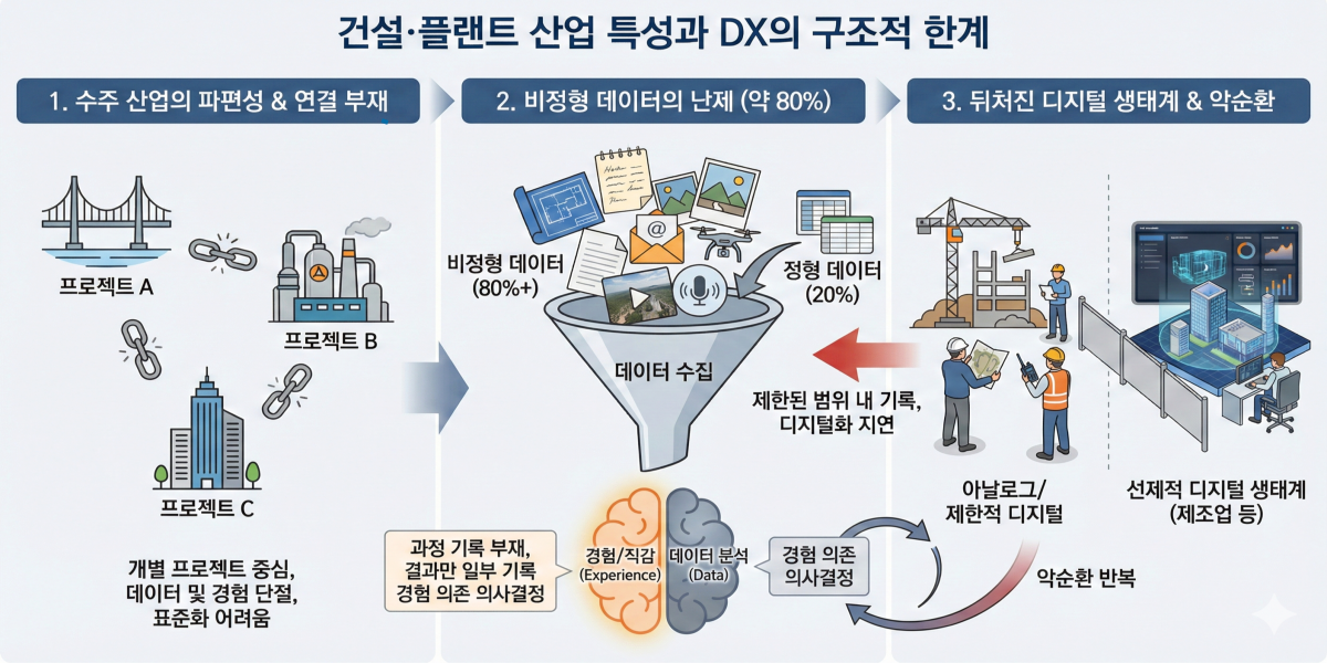 그렇지 않아요. 건설업과 플랜트가 가진 산업 특성이 있거든요. 수주 산업이라 개별 프로젝트마다 파편화돼 있고, 데이터 관리에도 한계가 있어요.