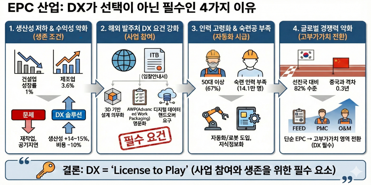 중국과의 기술 격차가 0.3년밖에 안 되고, 선진국 대비 기술 수준은 82%에 그치고 있어요. 단순 EPC에서 FEED, PMC, O&M 같은 고부가가치 영역으로 전환해야 하는데, DX 없이는 불가능하다는 거죠.