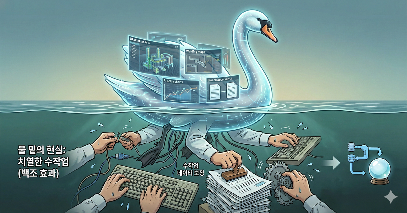 백조 효과라고 하더라고요. Swan Effect. 위로는 평온하고 아름답게 보이는데 물 밑에서는 발을 열심히 젓고 있는 거죠. 데이터가 자동으로 연계되고 수기 작업 없이 자동으로 끌어올려져서 각 요소에 꽂히는 게 아니라, 여전히 사람이 일일이 보정하고 있는 거예요.