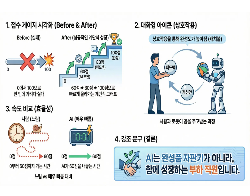 "첫 번째는 완벽주의를 버리는 겁니다. 저는 이걸 '60점주의'라고 불러요. 생성형 AI는 처음에 60점이나 70점 정도밖에 못 냅니다. 하지만 우리에게 반드시 100점이 필요한 건 아니거든요. 60,70점이라도 AI와 몇 번 주고받으면서 80점, 90점으로 만들 수 있어요. 중요한 건 초기 60,70점을 얻는 속도가 엄청나게 빠르다는 겁니다."