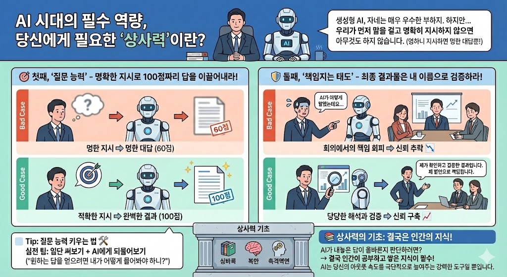 "상사력에는 두 가지 요소가 있습니다. 첫째는 '질문을 하는 능력'이에요. 생성형 AI는 매우 우수한 부하지만, 우리가 먼저 말을 걸지 않으면 아무것도 안 해줍니다. 멍하니 지시하면 멍한 대답밖에 안 나와요. 정확한 지시나 질문을 던져서 60점짜리 대답을 100점에 가깝게 이끌어가는 능력이 필요합니다."