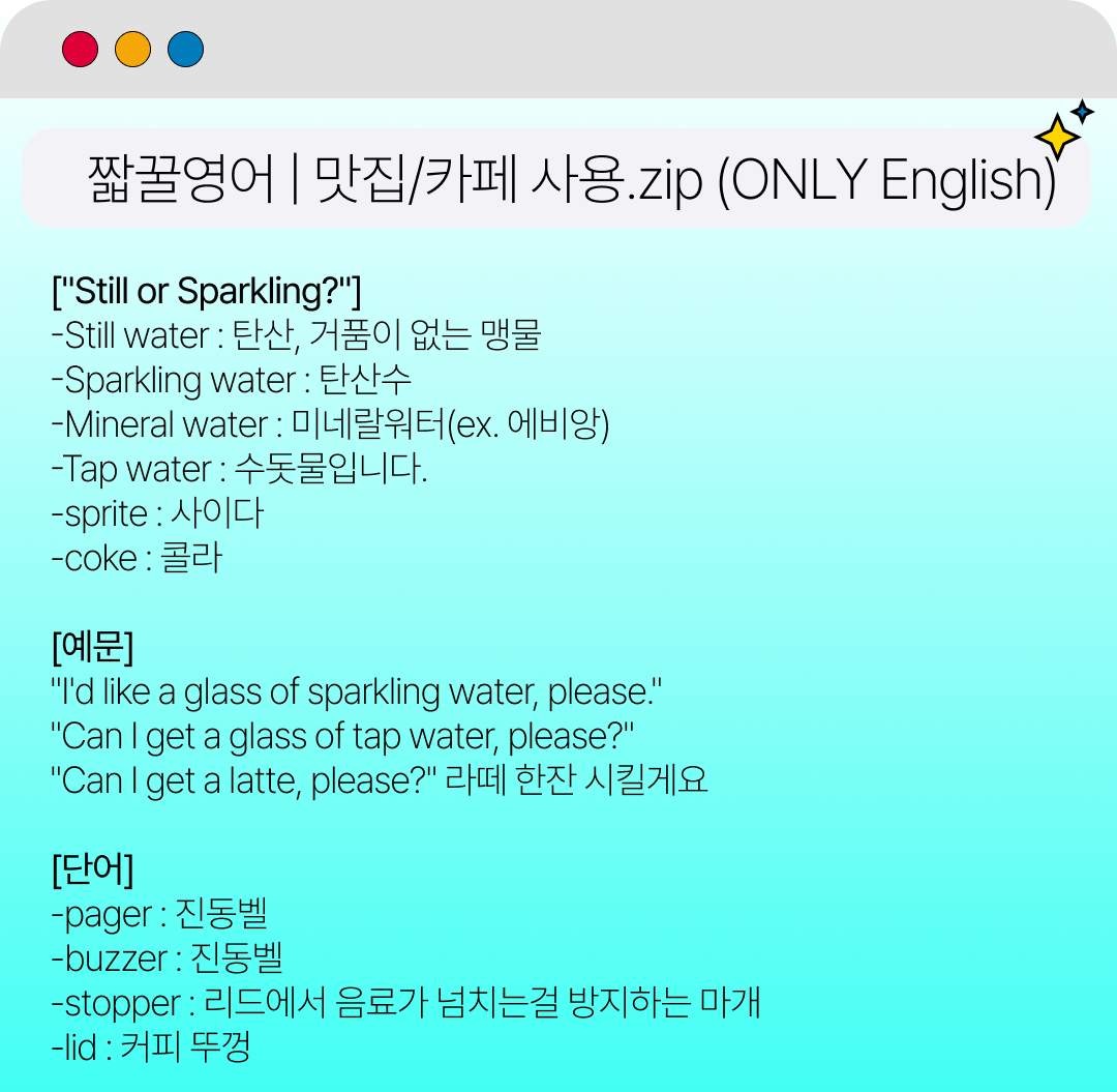 쇼츠를 보면 알 수 있듯, 비단 주문할 때 난생처음 듣는 표현으로 버벅대는 건 비단 한국인만의 문제는 아닌 것 같습니다. 물론 이 쇼츠에서의 표현은 물을 돈 주고 사 먹는 나라의 여행에서 유독 문제가 되는데요! 한국처럼 식당에서 제공하는 물에 따로 요금을 대개 매기지 않는 미국, 일본 등의 나라에서는 기본적으로 물이 제공되기 때문에 이런 표현을 사용할 일이 많이는 없겠죠?😌