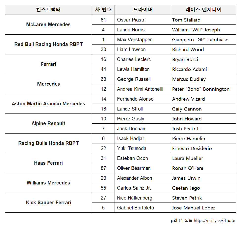 2025시즌 두 번째 끼워넣기 메일입니다. 오늘로 시즌 전 테스팅이 시작되었지요? 팀 + 드라이버 소개에 이어 이번에는 레이스엔지니어 편입니다. 별 거 없지만 그래도 한 번 짚고 가고 싶은 마음: 그냥 제가 이 포지션을 대단히 좋아합니다. 현 F1 그리드에 딱 스무 자리가 있는 만큼 이 사람들 자리도 딱 스무 개라고요! 희소성에 있어서는 엪1드라이버끕 동시에 왠지 모종의 취향을 가진 사람들을 자극하는 그런