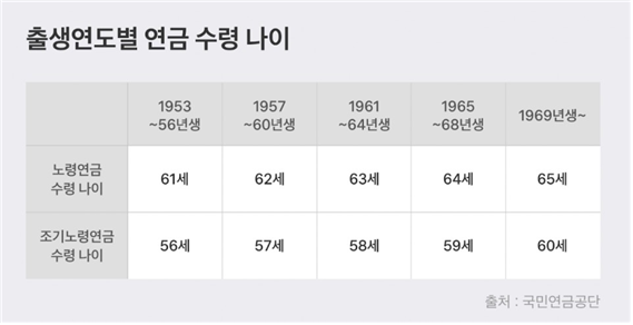 우리나라 근로자의 정년은 60세 이상으로 규정되어 있으나, 1969년 이후 출생자의 경우 연금 정상 수령 나이가 65세인 점으로 보아 최대약 5년 이상의 소득 공백이 발생할 것을 알 수 있습니다.