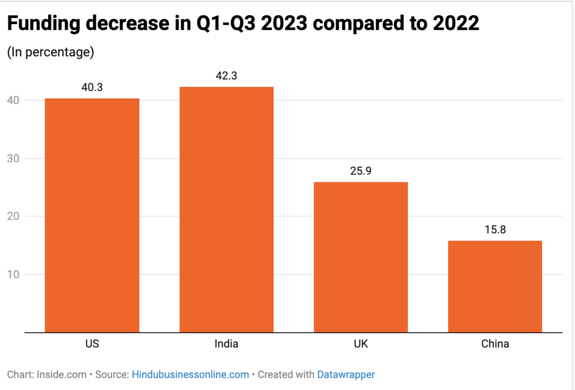 - 2023년 첫 9개월 동안 미국의 VC 펀딩 거래 규모는 2022년 같은 기간에 비해 40.3%, 영국은 25.9%, 인도는 42.3% 감소했습니다.