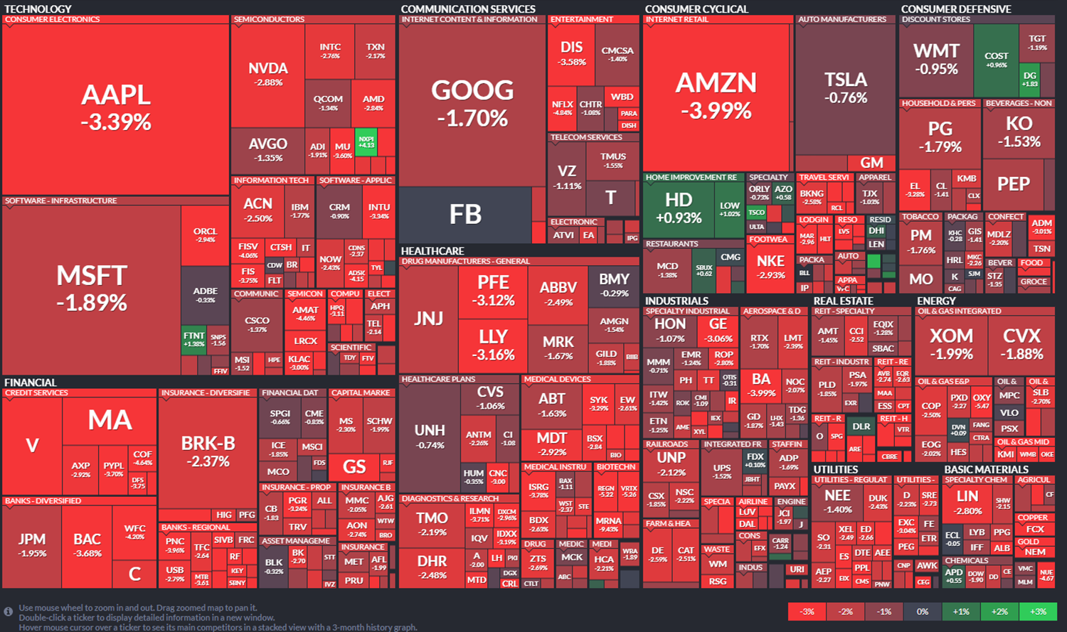 일부종목을 제외하곤 모조리 하락마감했습니다. 섹터별로 살펴봐도 상승한 섹터는 단 한곳도 없습니다. 기세등등하던 에너지 주조차 오늘의 공포를 피하지 못했습니다.