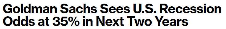 골드만삭스가 2년내에 경기침체가 온다고 전망한 전문가가 35%에 달한다고 밝혔습니다. 현재 미국 경제시장은 위기감이 감돌고 있습니다.