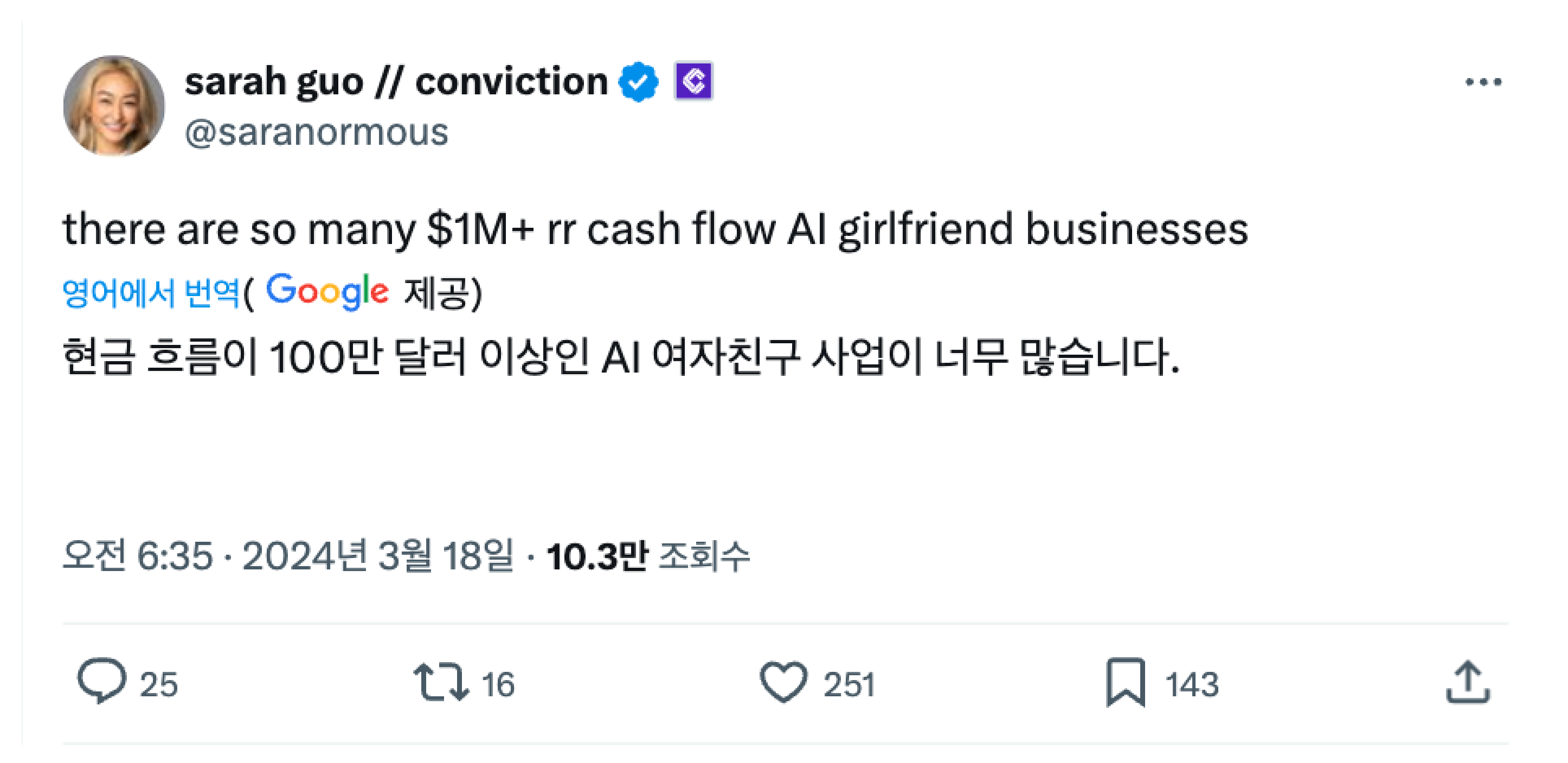 ”AI 여자친구는 커스터마이징이 가능합니다. 좋아하는 것, 싫어하는 걸 입력할 수 있습니다. 편안해요”Greg Isenberg Twitter
