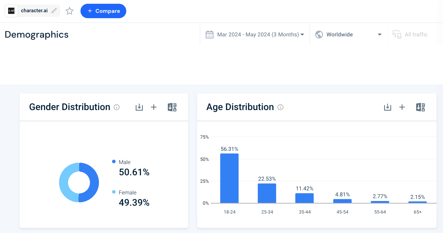 특이하게도 사용자의 성비는 5:5로 동일합니다. 대부분의 다른 AI 채팅 서비스의 주요 이용 고객은 남성인데 말이죠.