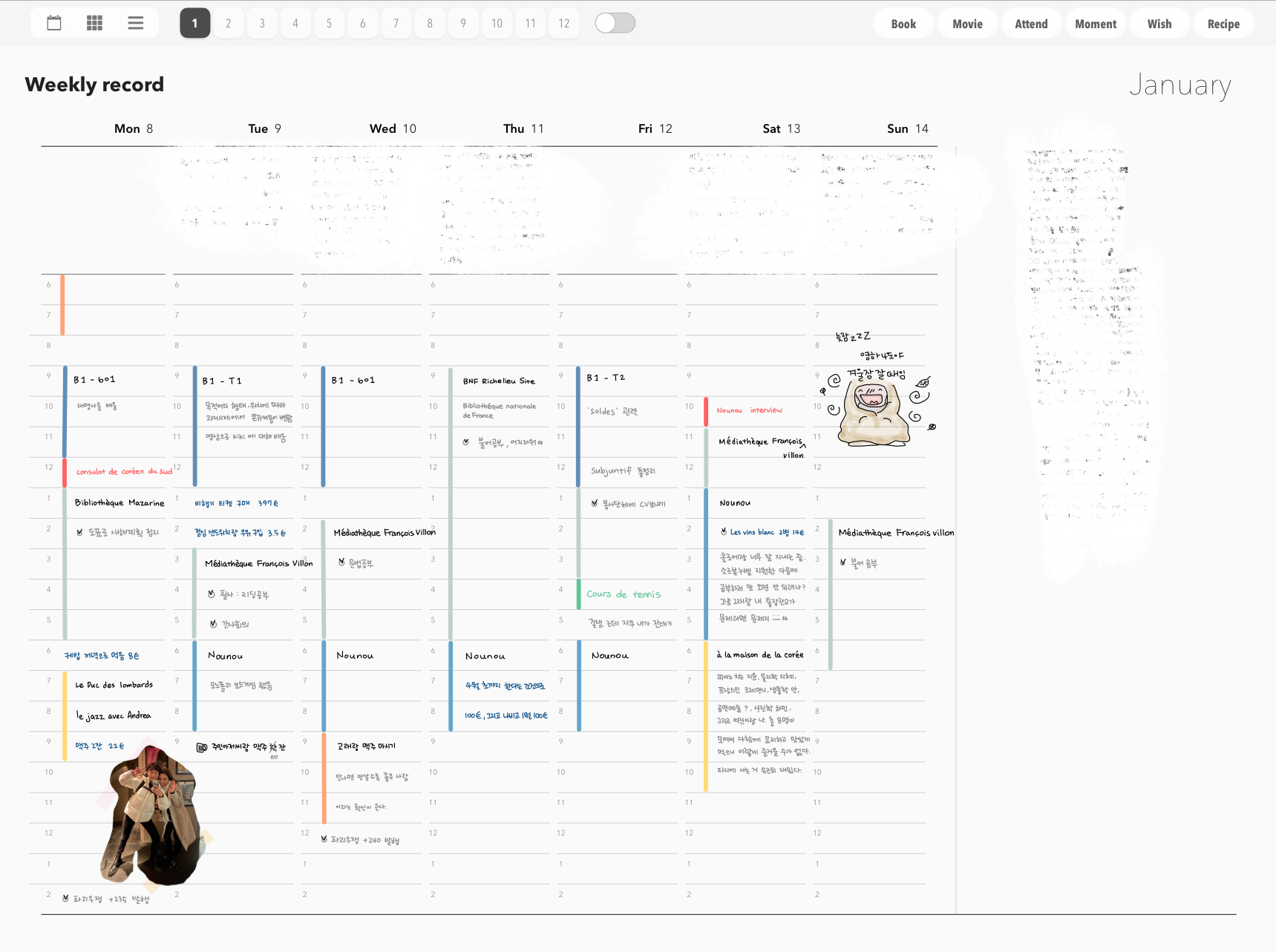 진한 파란색은 어학원 수업, 연한 파란색은 베이비시터, 연한 초록색은 도서관에서 공부, 노란색은 친구와의 약속, 살구색은 고래랑 데이트, 빨간색은 대사관 방문처럼 중요한 일정으로 지정했다. 다 채우고 나면 상당히 알록달록해진다. 한 주 동안 주로 무엇을 하며 보냈는지 한 눈에 확인할 수 있어서 좋고, 꽉 채워진 주간 일정을 보면 괜시리 뿌듯해진다. 한국에 돌아가면 이 기록들을 보며 지금을 그리워하겠지?