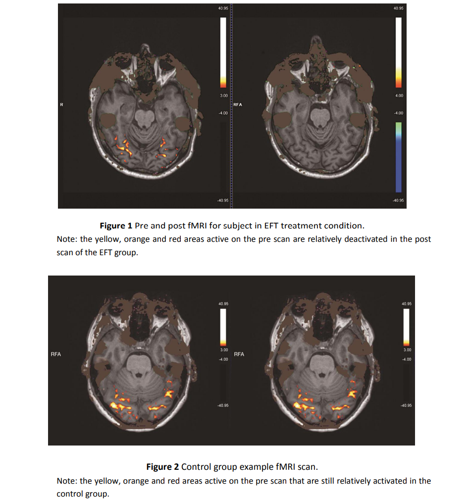 EFT 기법을 적용하며 뇌 영상 검사를 하는 연구가 있었습니다. 이 연구에서 EFT는 표적이 되는 감정을 담당하는 뇌 영역을 직접 변화시키는 것으로 나타났습니다.