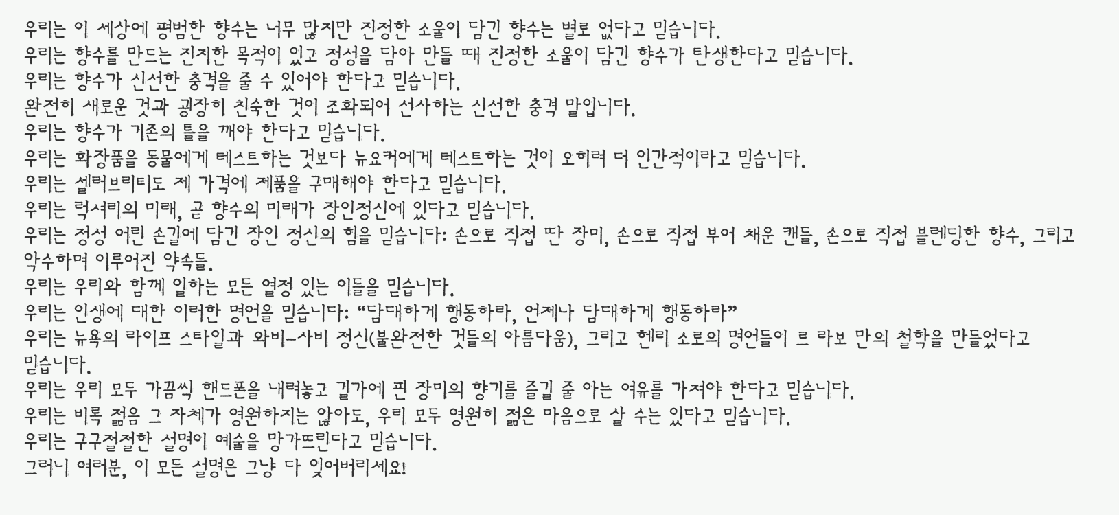 우리는 향수가 기존의 틀을 깨야 한다고 믿습니다.