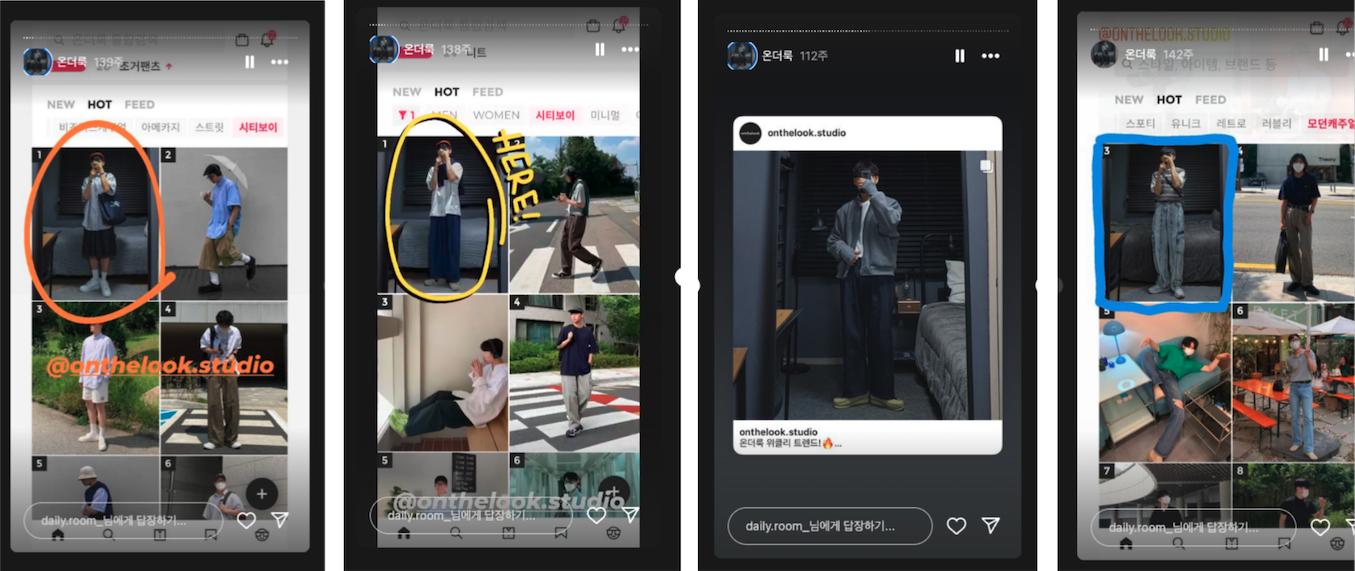 온더룩 랭킹에 진입한 크리에이터들에게 해당 화면을 캡처하여 전달하고 스토리 공유를 요청한다거나, 저희의 계정 속 명예의 전당에 게시를 해주는 거죠. 그렇게 되면 그들은 그걸 공유하게 되고, 그들의 팔로워들은 결과적으로 온더룩이라는 서비스를 접하게 돼요.