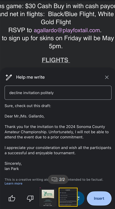 한가지 추가하자면 구글 Gemini Advanced는 이미 Gmail과 Google Meet등 모든 패키지에 들어가기 시작했으며 아래와 같이 이메일 작성 자동화가 가능합니다. 제일 무서운 부분이요? 저는 처음 받은 이메일인데 보낸 사람이 agallardo@playfoxtail.com으로 답장을 달라고했더니 (1) 미국 회사 이메일들이 first name의 첫글자 + last name으로 이메일을 많이 만든다 (2) Agallardo라는 성은 흔치않다 (뇌피셜)을 기반으로 Mr/Ms Gallardo가 성일 것이라고 판단한 부분입니다. 제 이메일 데이터를 다 가지고 있는 지메일이 충분히 할수있는 플레이가 아닐까 생각합니다.