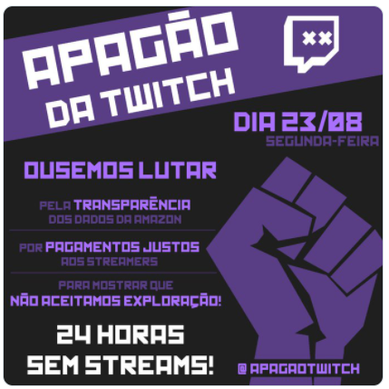 게임을 전문으로 하는 인터넷 동영상 스트리밍 플랫폼인 트위치(Twitch)에서도 최근 들어 스트리머들의 파업이 연이어 일어나고 있다. 2021년 8월 23일, 브라질에서는 스트리머들이 플랫폼 콘텐츠 제작자에게 공정한 지불을 요구하고 아마존 데이터의 투명성을 요구하기 위해 소위 "Apagão da Twitch(포르투갈어로 ‘트위치 끄기’라는 뜻)"를 조직했다. 이들의 설명에 따르면 올해 7월 트위치가 구독서비스 이용료를 낮추면서 스트리머들에게 지불된 돈이 이전보다 1/3 수준으로 감소했다고 한다. 이러한 정책은 이미 수많은 팔로워를 보유한 대형 스트리머보다는 중소규모 스트리머들에게 매우 불리한 영향을 미칠 것으로 전망된다. 이전과 같은 소득 수준을 유지하기 위해 구독자 수를 늘리기 위해서는 많은 시간과 노력이 들어가는데 그 과정 동안 버틸 수 있는 자원이 부족하기 때문이다.