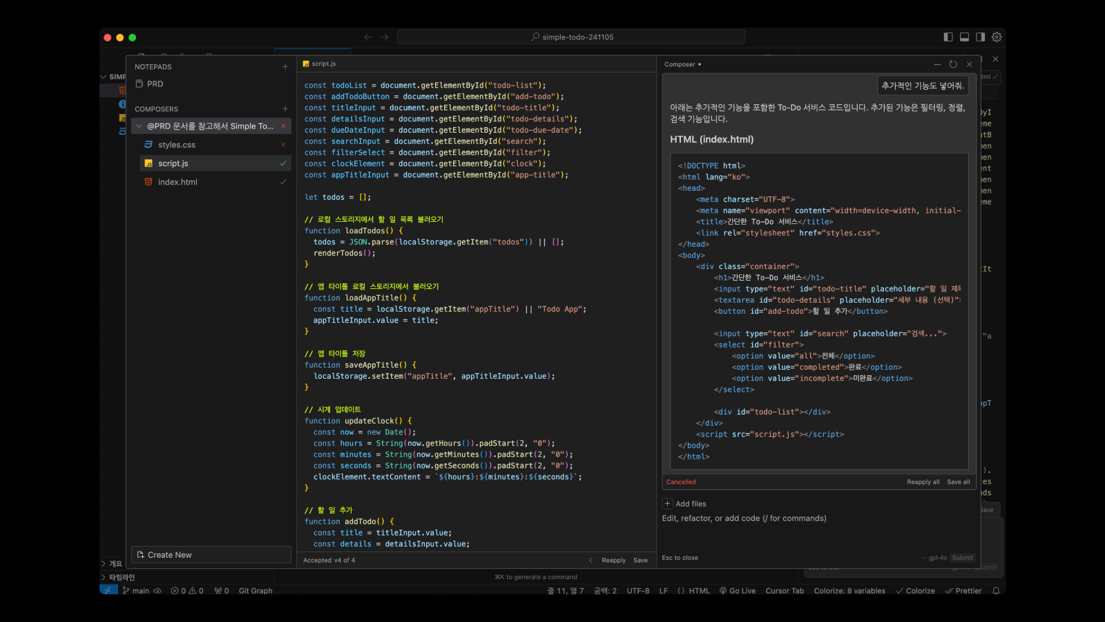 Cursor는 이 요청에 맞춰 기본적인 To-do List의 구조를 만들어 주고 할 일 목록을 추가하고 삭제하는 기능을 자동으로 생성합니다. 단 몇 초 만에 프로젝트의 뼈대가 완성되는 경험을 하실 수 있습니다.