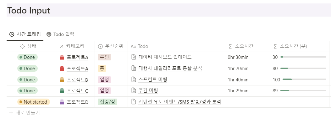 이런 식으로 하나의 일에 걸린 시간을 버튼 타이머를 통해 측정하면, 개별 Todo들의 소요시간을 모아서 볼 수 있습니다. 어떤 일을 완료했고, 무엇이 남았는지 Todo 관리와 함께 소요 시간까지 동시에 트래킹할 수 있다는 장점이 있죠.