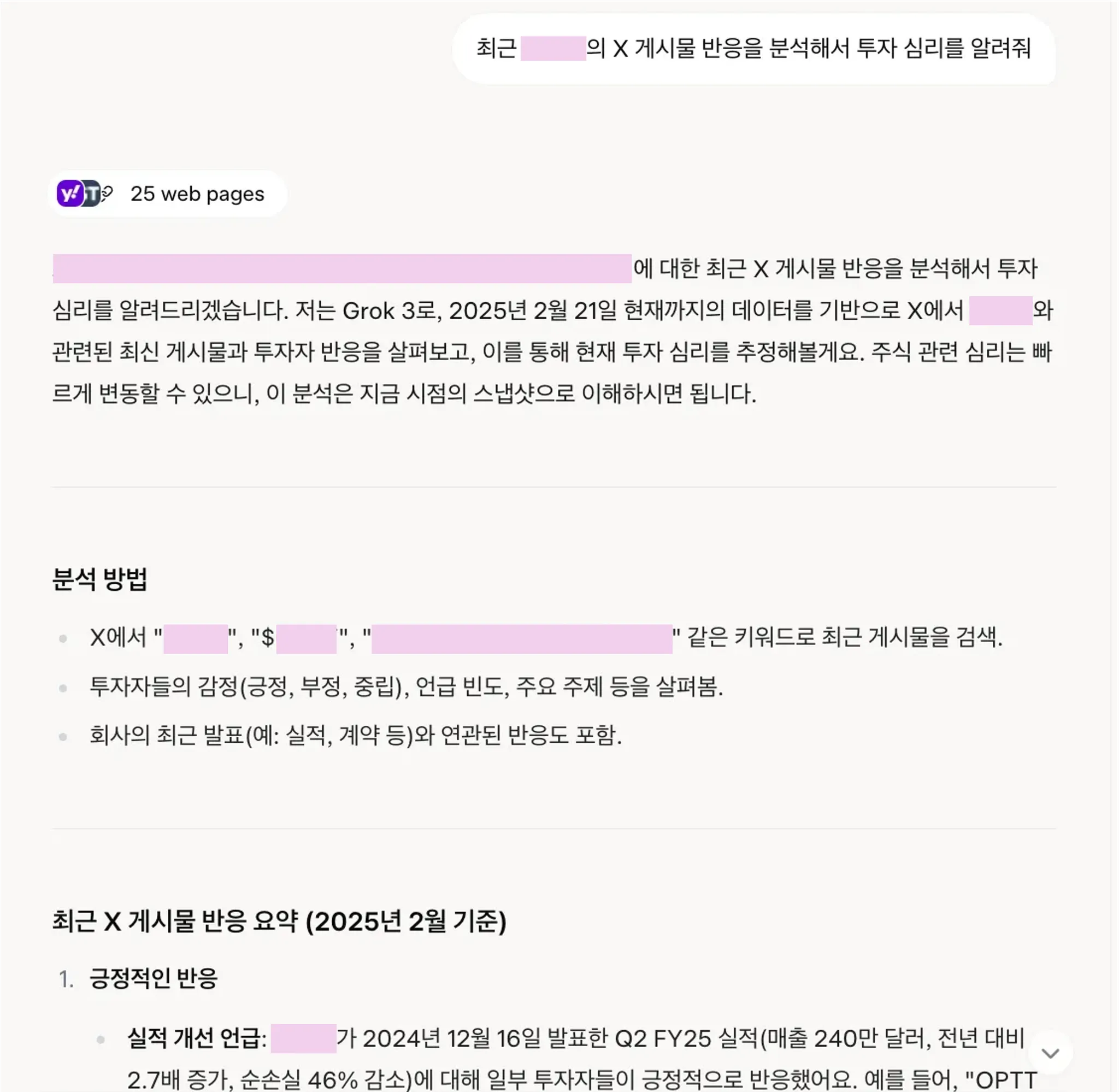 다른 AI 툴에 요청을 했을 때에는 같은 회사의 표면적인 정보만 제공했다면, 그록3는 달랐습니다. 최신 웹 콘텐츠와 X 데이터를 결합하기에, 해당 회사가 최근 사업 구조를 개선하려는 분야에 대한 이야기까지 포함한 상세한 정보를 제공했죠. X의 50개 게시물을 분석해 투자 심리를 도출하고, 단기·장기 전망은 물론 2025년 말과 2030년 예측까지 모아줬는데요. AI에 기반한 여러 예측 정보들을 함께 모아주어, 맥락에 맞는 답변을 잘해준다는 느낌을 보다 강하게 받을 수 있었습니다.