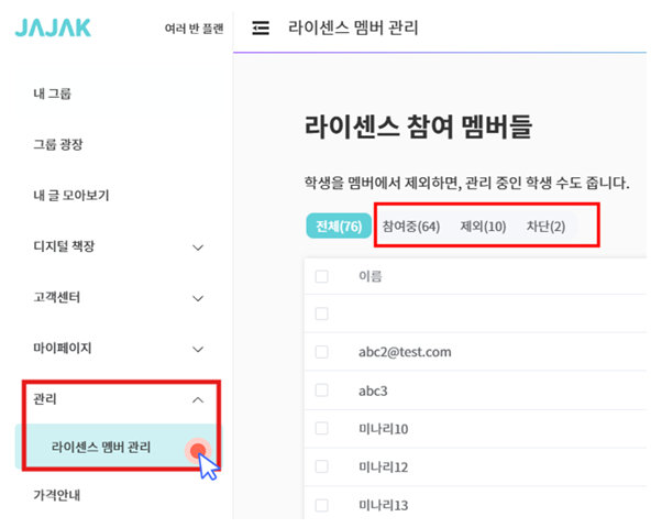 자작자작의 유료 플랜은 플랜에 따라 학생 참여자 수가 제한되어 있습니다. 새로운 학기를 맞이하여 기존 그룹의 참여자를 사용하고 계신 플랜에서 제외하고자 하신다면 보다 쉬워진 멤버 관리 기능을 이용해 주세요.