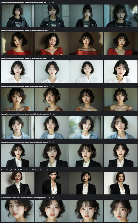 이 프롬프트에서 주요 특징은 일관되게 유지되는 반면, 머리 길이와 메이크업과 같은 구체적인 세부 사항은 고급스러운 스타일을 정의하는 데 도움이 됩니다. 🥂