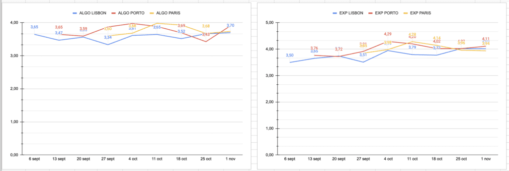 A: 매주 각 도시의 경험 점수를 측정하고 개선하고 있어요. 전체적인 경험, 레스토랑, 매칭 적합도를 5점 척도로 평가해요. 9월에서 10월 사이에 리스본에서는 7.9%, 포르투에서는 8.8%, 파리에서는 6.3% 개선됐어요.