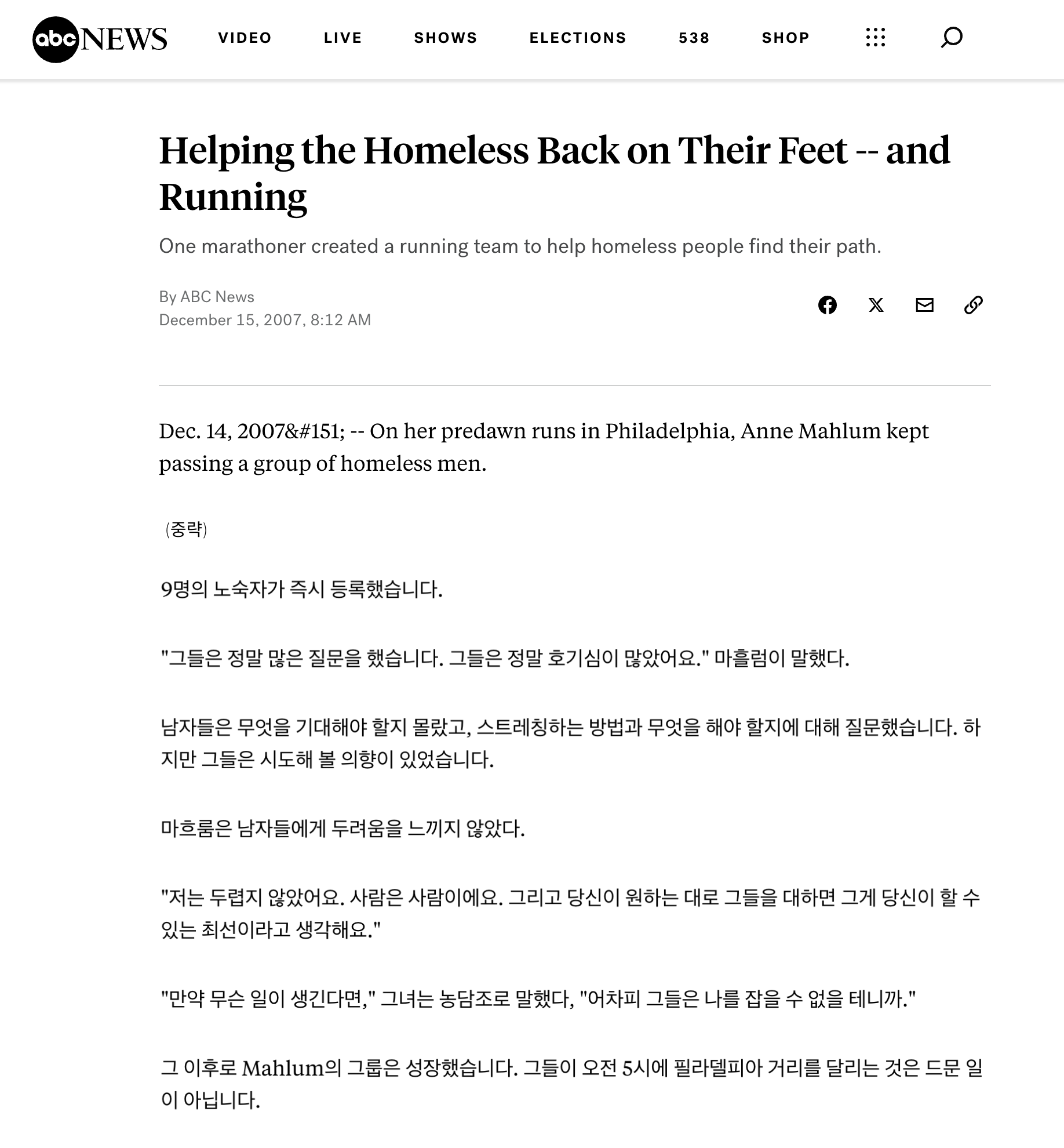 A: 저는 'Back on My Feet'라는 비영리 단체를 운영했어요. 노숙자들과 함께 달리기를 하며 그들의 삶을 변화시키는 게 목표였죠.