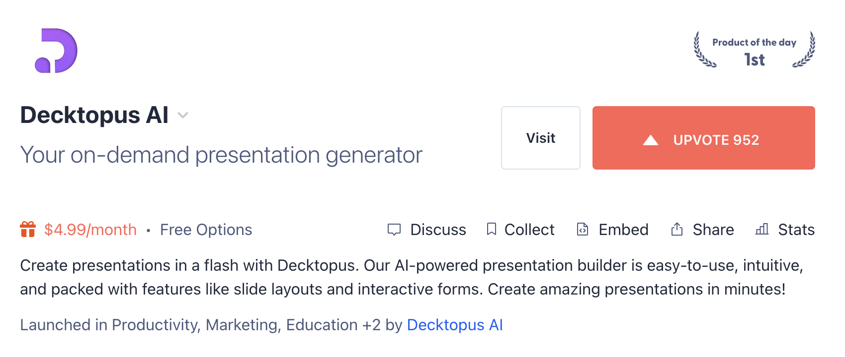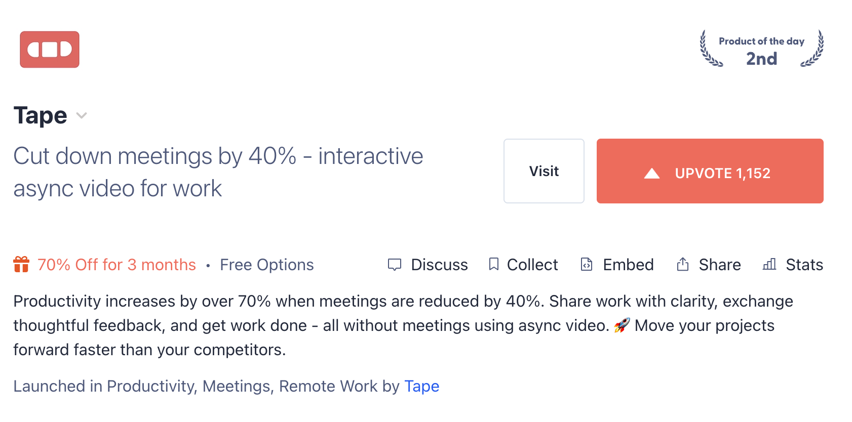 Product Hunt는 각종 IT 서비스들을 모아놓은 메이커 플랫폼입니다. 전 세계 400만 명이상의 회원 수를 보유하고 있습니다. 일간 ProductHunt는 매일매일 메이커들이 올리는 서비스들을 소개합니다.
