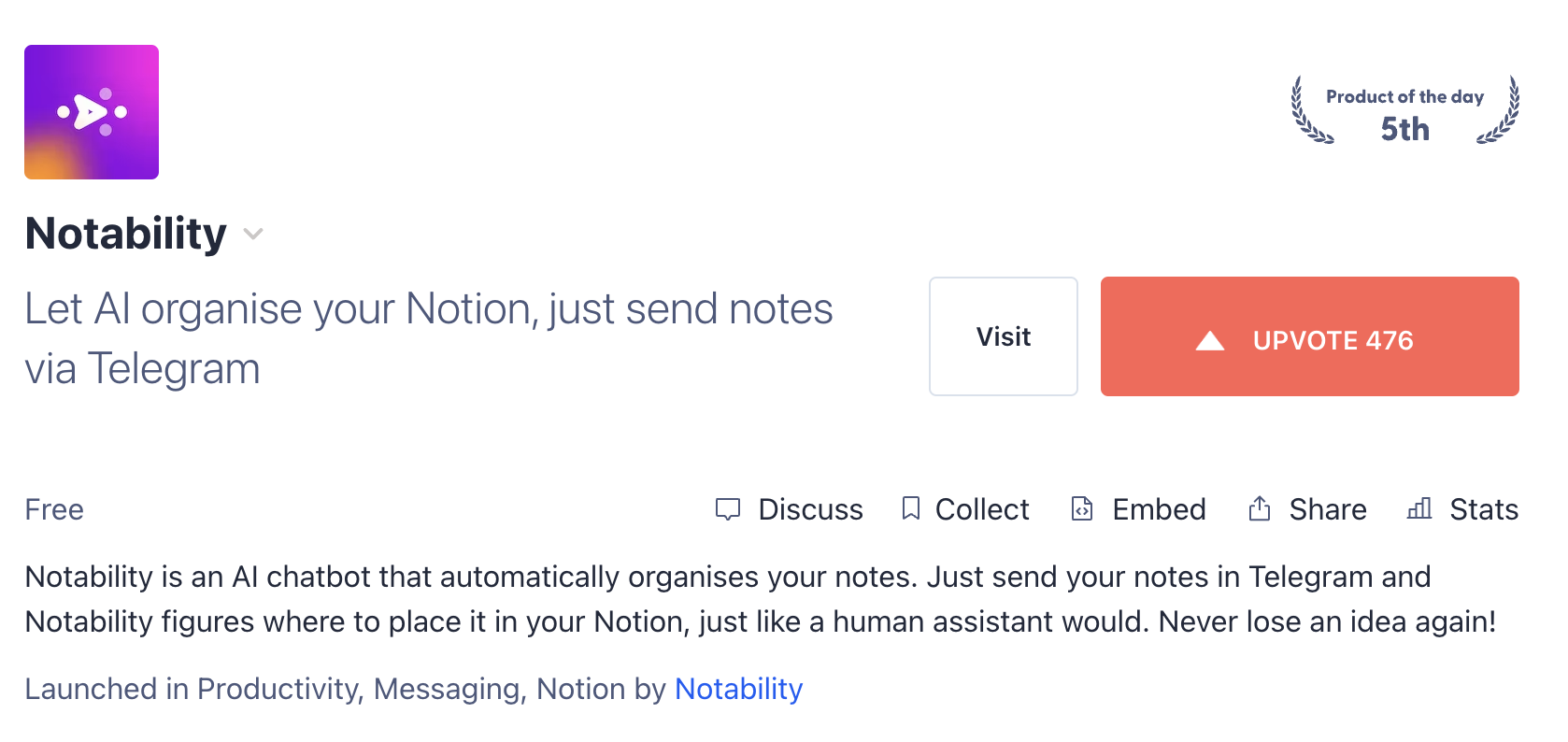 Product Hunt는 각종 IT 서비스들을 모아놓은 메이커 플랫폼입니다. 전 세계 400만 명 이상의 회원 수를 보유하고 있습니다. 일간 ProductHunt는 매일매일 메이커들이 올리는 Top 5 서비스들을 소개합니다.