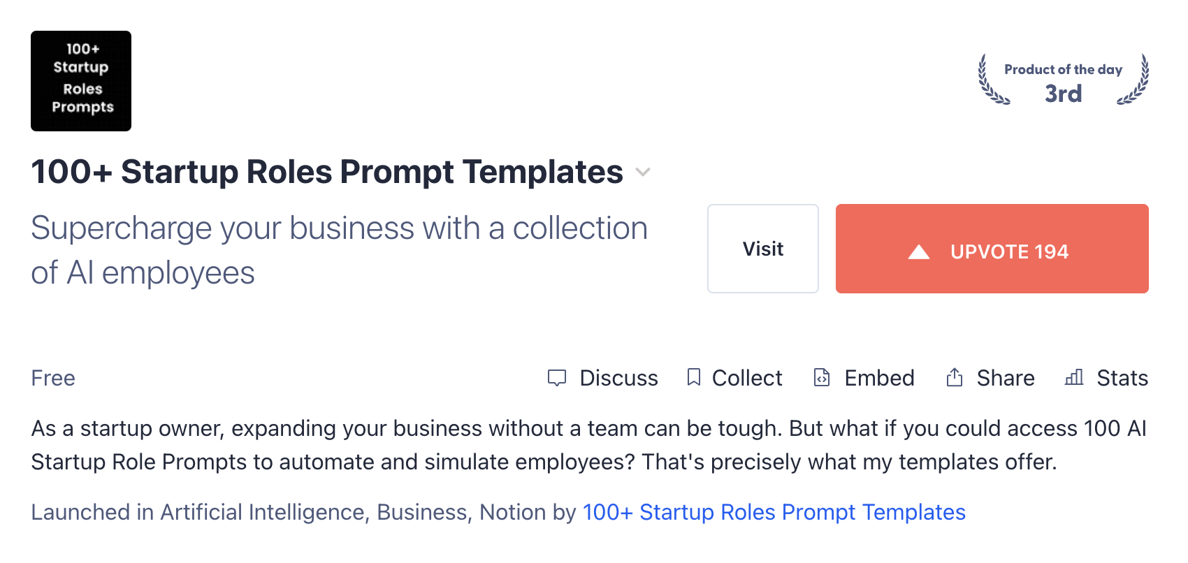 스타트업 오너를 대상으로 한 서비스입니다. 비즈니스를 자동화하고 성장시키는 데에 AI를 활용할 수 있다고 합니다. CEO부터 프로덕트 디자이너까지 각각의 역할에 대한 프롬프트 템플릿을 Notion으로 작성해 준다고 하는데, GPT-3와 ChatGPT를 활용한 것 같습니다. 5달러가 필요하기 때문에 테스트는 못 할 것 같습니다.