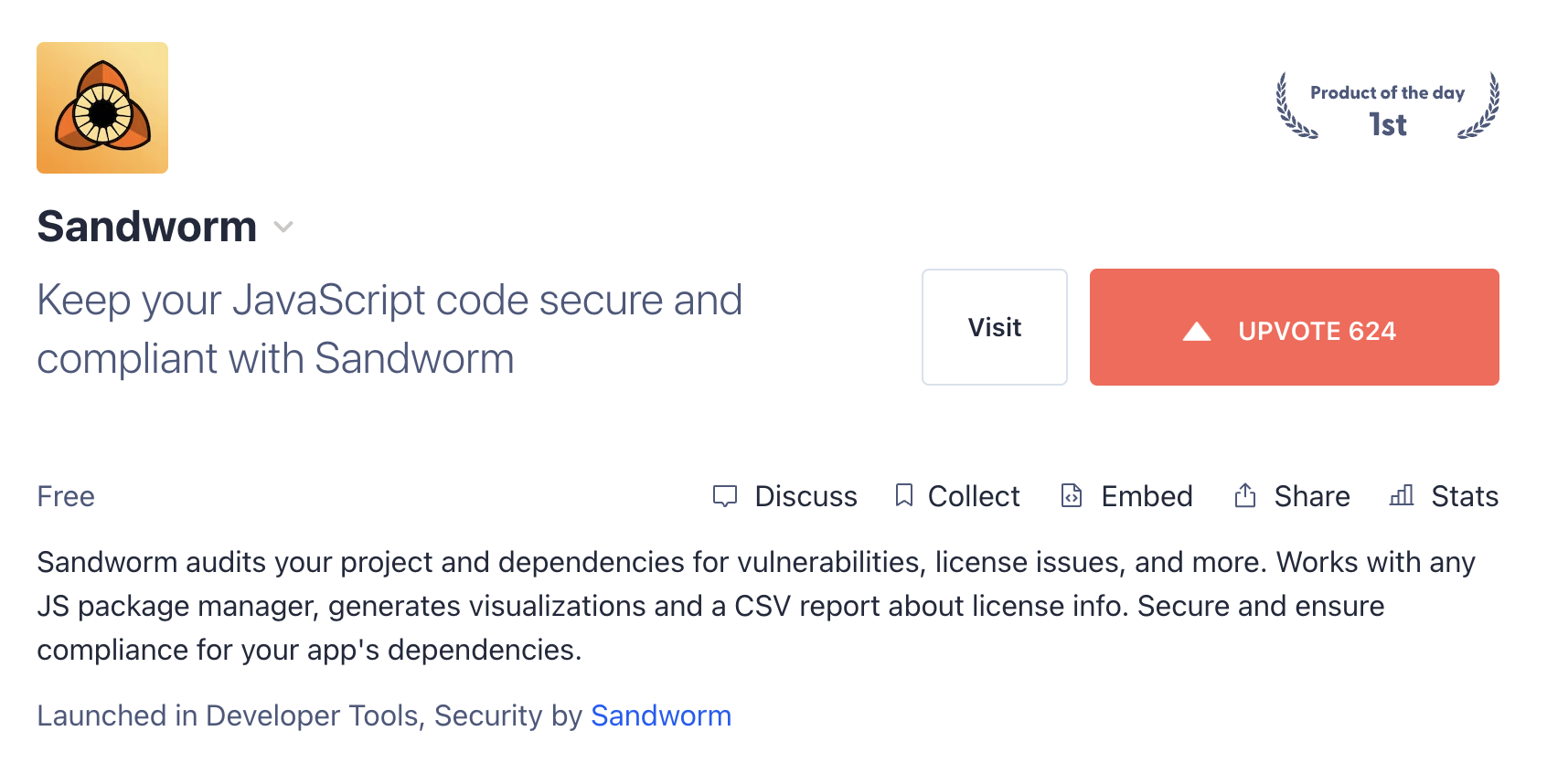 Javascrip 관련 개발자를 위한 서비스가 일간 1위를 했네요. 모든 JS 패키지를 관리하고 라이선스 정보의 시각화 및 CSV 보고서를 생성한다고 합니다.