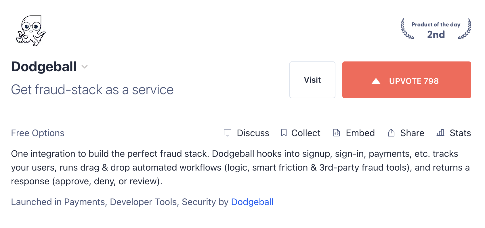 조금 이해하기 힘든 제품이였습니다. 가입, 로그인, 결제 등의 로직에 보안 시스템을 갖춰 주도록 돕는 서비스라고 이해하시면 될 것 같네요. 또한 노코드로 수행할 수 있도록 만들었습니다. Dodgeball은 자신들의 서비스를 다음과 같이 소개하고 있습니다.