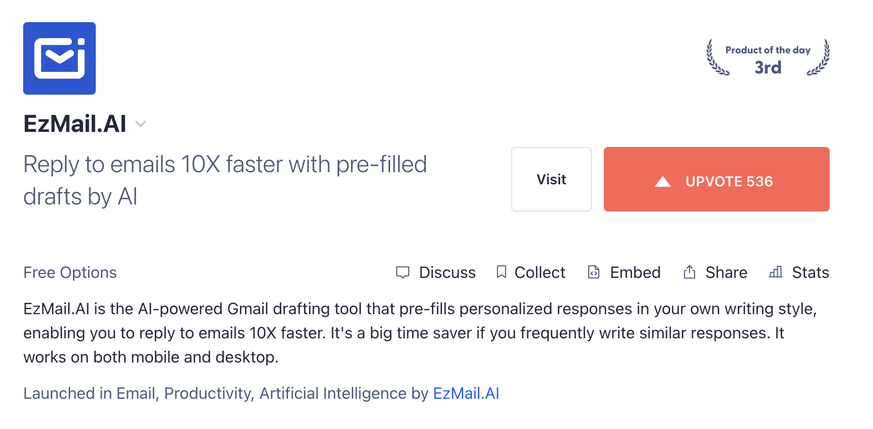 Product Hunt는 각종 IT 서비스들을 모아놓은 메이커 플랫폼입니다. 전 세계 400만 명이상의 회원 수를 보유하고 있습니다. 일간 ProductHunt는 매일매일 메이커들이 올리는 서비스들을 소개합니다.